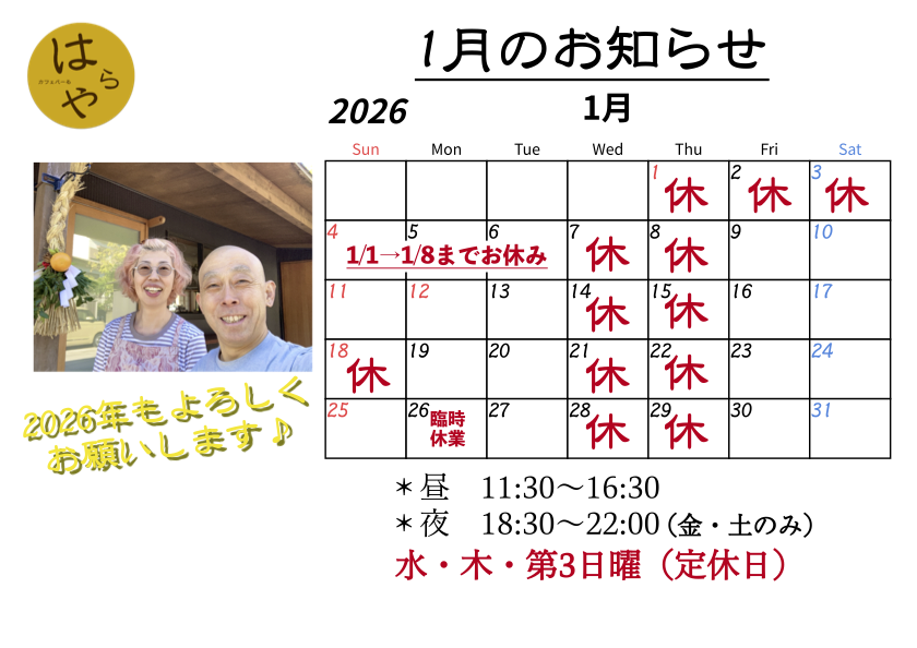 カフェバーる はらや  1月のお知らせ