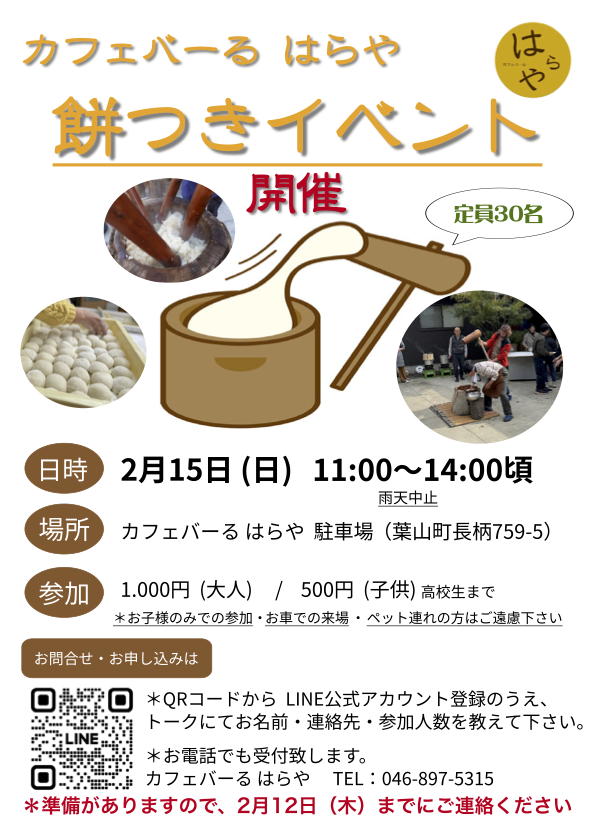 2月15日 (日) 『餅つきイベント』を開催致します。皆様のご参加お待ちしています。はらや